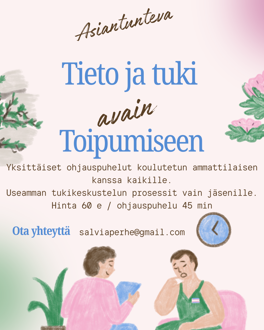 Tukemme on matalan kynnyksen tukea. Voit ensin keskustella yksilöllisesti vertaisen kanssa ja tulla sitten vertaisryhmään, joka on käynnistysvaiheessa. Kokoontumisten ajankohta (etänä zoomissa) selviää myöhemmin.